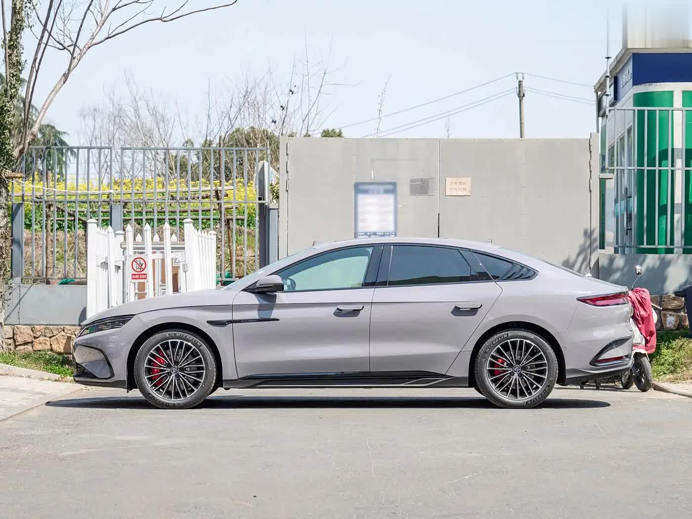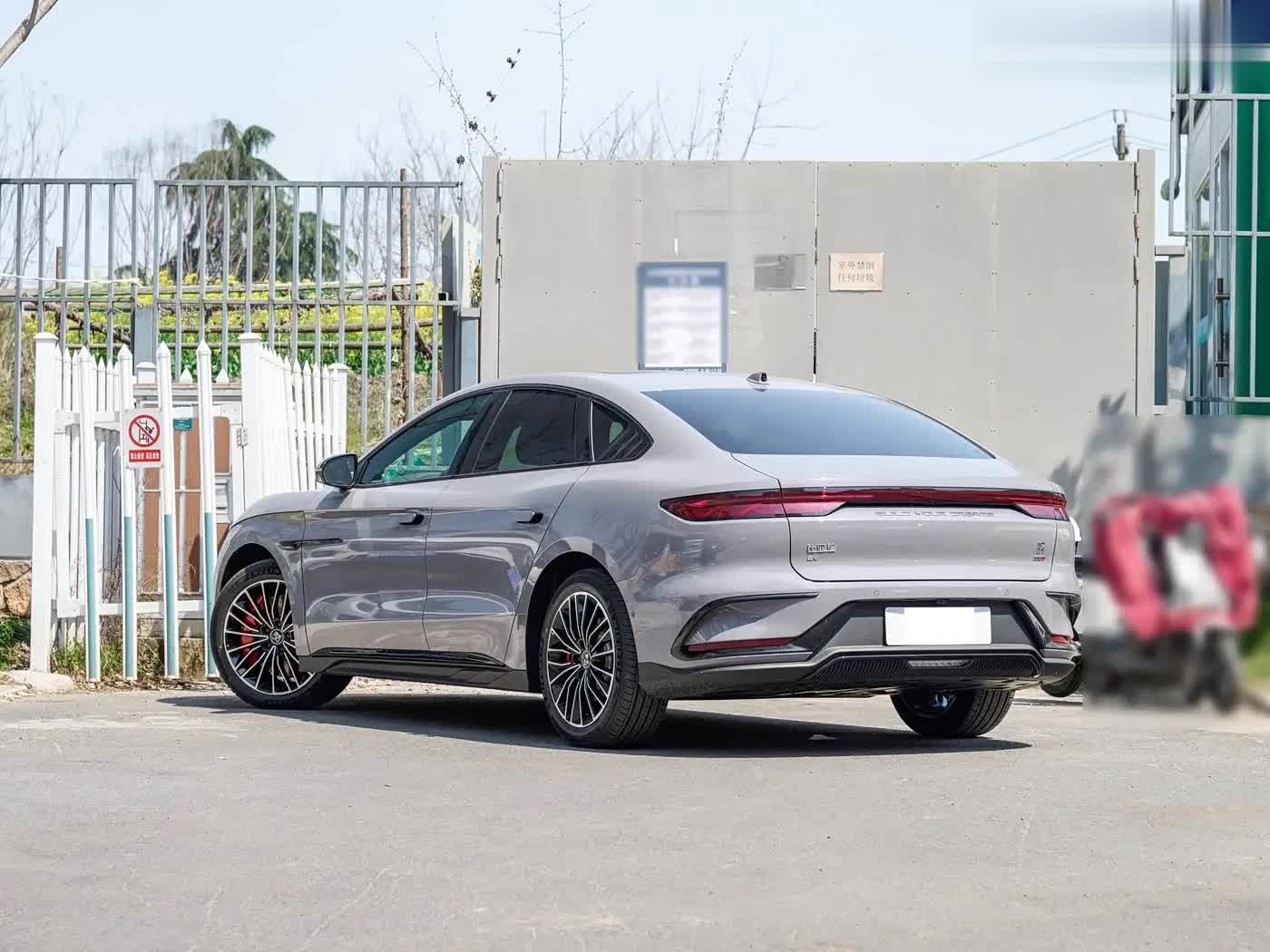 再来看车身侧面部分,车身尺寸维持4995mm×1910mm×1495mm,轴距2920mm,溜背线条从A柱顺滑延伸至车尾,搭配全新19英寸多幅式熏黑轮毂,视觉上更显修长优雅。腰线凌厉硬朗,车窗线熏黑处理强化低趴姿态,隐藏式车门把手与五辐式轮毂呼应,尾部小鸭尾造型增添灵动气质。新增未央灰金属渐变车色,搭配哑光黑化套件(门把手、前后包围),运动版车型全车熏黑加红色卡钳,直接拉满战斗氛围。设计团队通过优化线条与配色,在保证内部空间的前提下,使整车风阻系数降低,兼顾美学与能效。