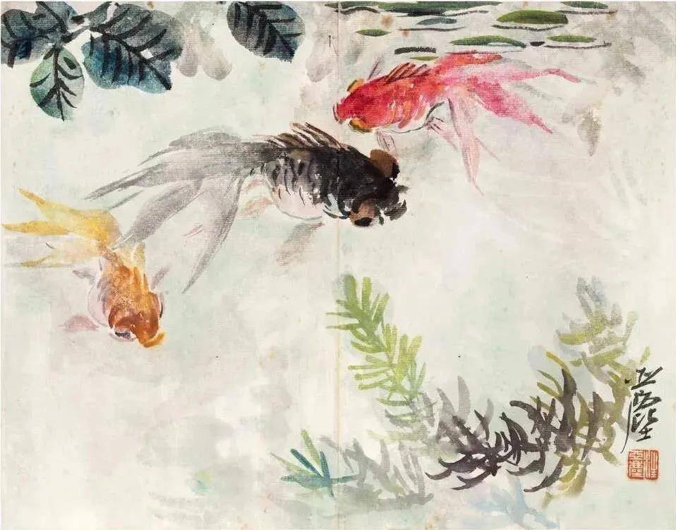 瞧那画里的金鱼,圆溜溜的眼睛鼓得像小灯泡,尾巴甩得那叫一个欢,仿佛下一秒就要从纸上“游”出来,在你面前摆着尾巴炫耀。汪亚尘画金鱼,用笔那叫一个潇洒,寥寥几笔,金鱼的形态就活灵活现,再配上那或红或橙的色彩,就像给金鱼穿上了华丽的舞裙,在水中欢快地舞蹈。