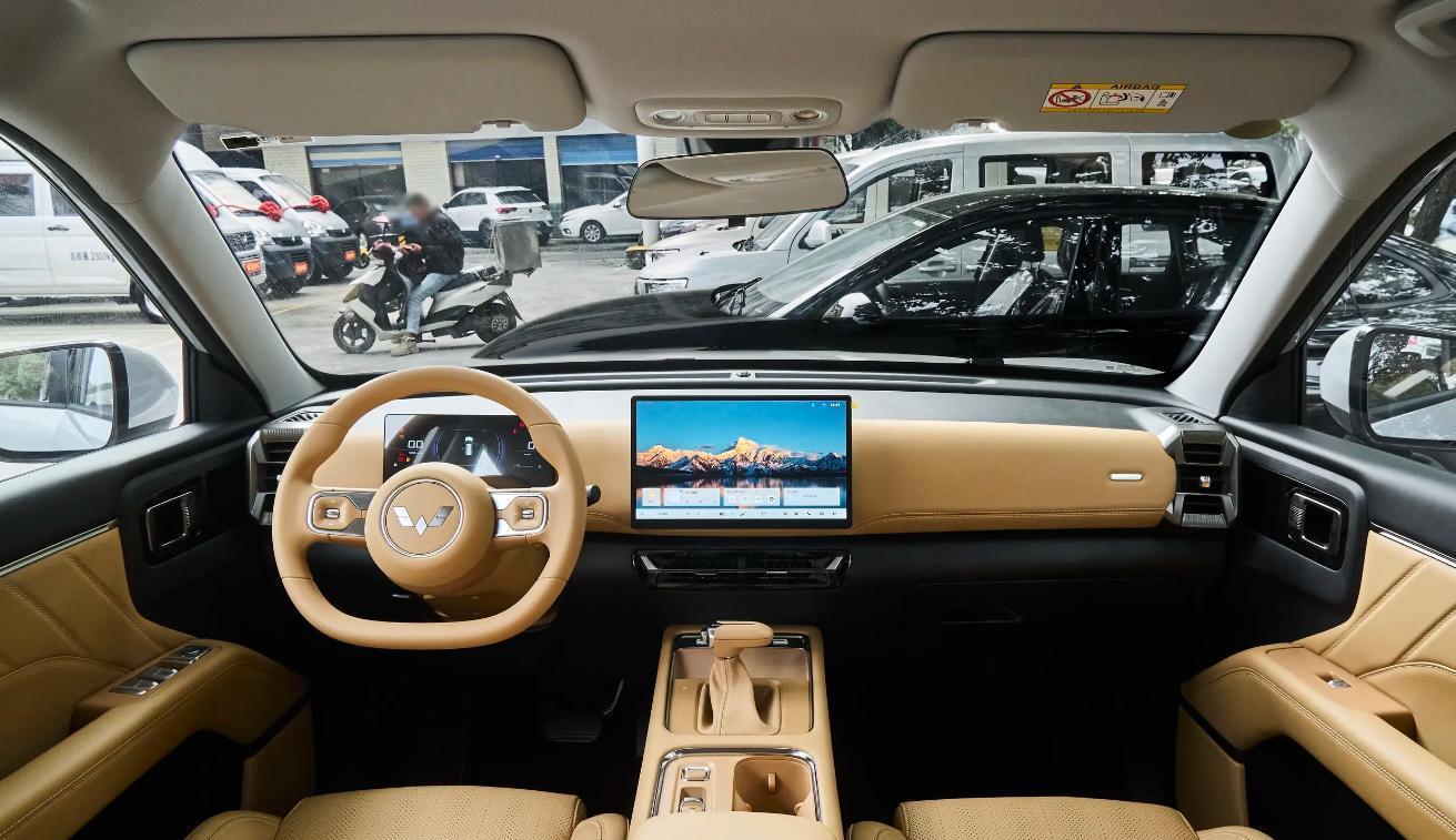 五菱星光560内饰采用简约,规整的风格,方向盘采用两幅式设计,液晶仪表的尺寸为3.5英寸,中控屏幕的尺寸为12.8英寸,车机系统还支持HUAWEI HiCar和Carlink,根据不同车型,座椅的材质也是不同,方向盘采用塑料材质。